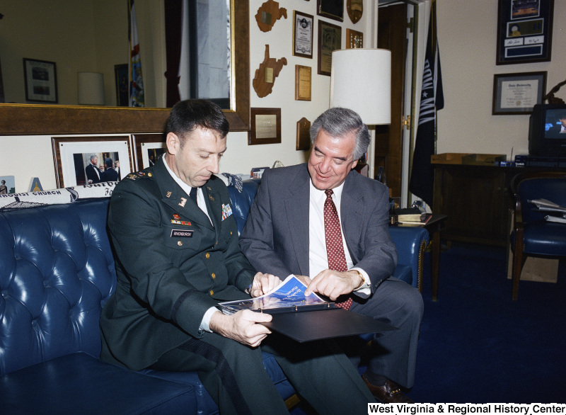 Photograph of Congressman Nick J. Rahall speaking with Military Officer Rivenburgh