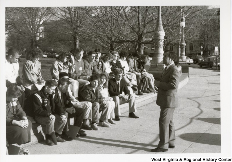 - Photograph of Congressman Rahall talking to a group of high school students in front of the U.S. Capitol Complex