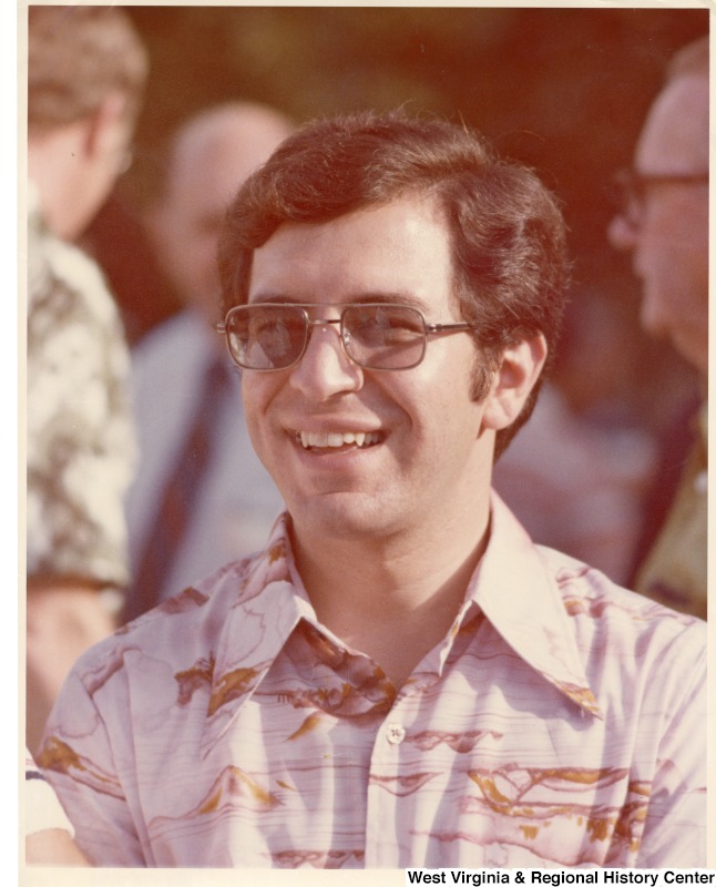 - Congressman Nick Rahall II wearing sunglasses and smiling. Photo was taken at the family home on Flat Top Lake at a volunteer party.