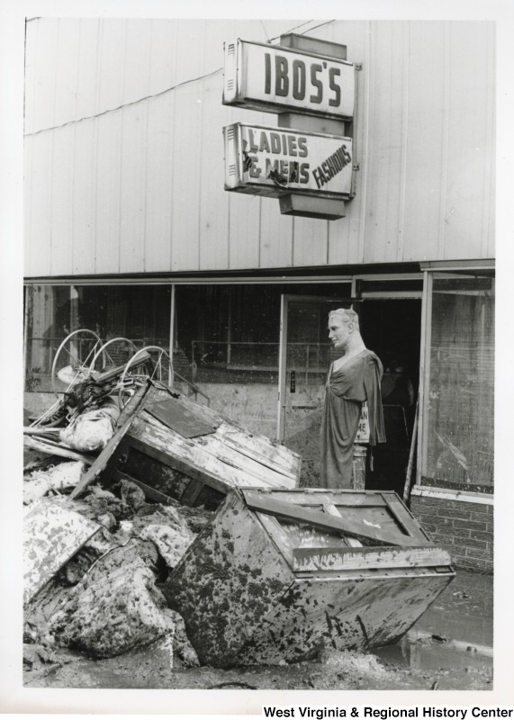 Photograph of flood debris in front of Ibos's Fashions