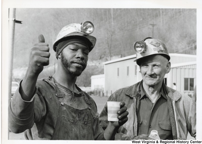 - Two unidentified men wearing hard hats in Mingo county. One is giving a thumbs up and holding a disposable cup.