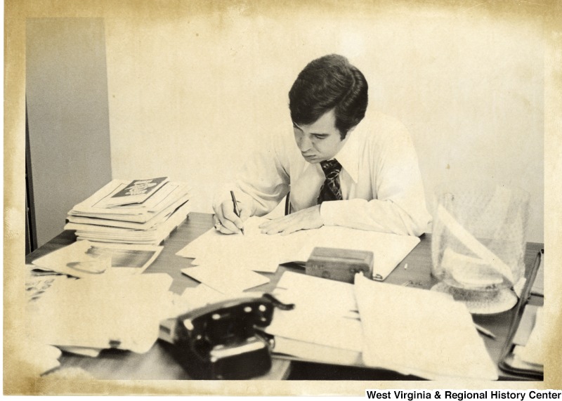 - Congressman Nick Rahall II working at a desk presumably helping with the Mingo county flood.