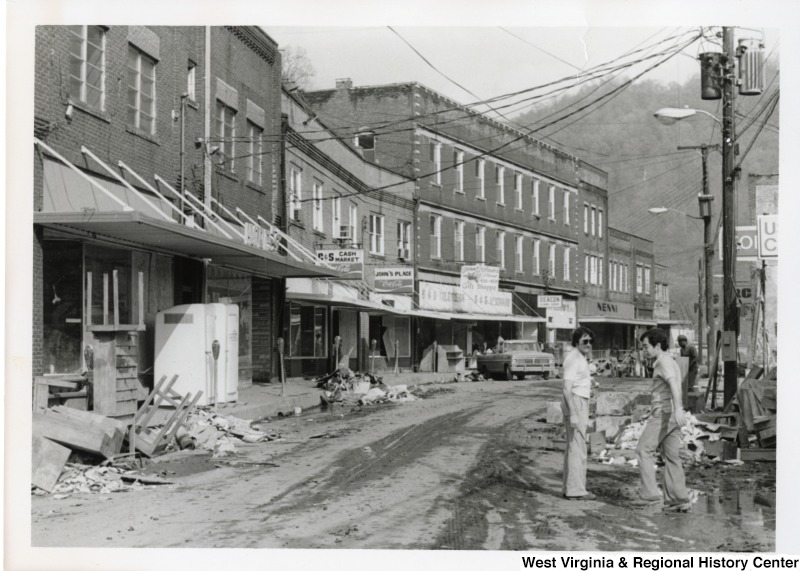 - A flood damage street in Mingo county. There are two unidentified men in the right corner of photograph. The street is littered with debris and damaged goods from stores.