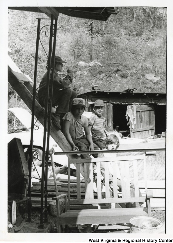 - Four unidentified boys sitting on a ladder against a flood damaged home in Mingo county.