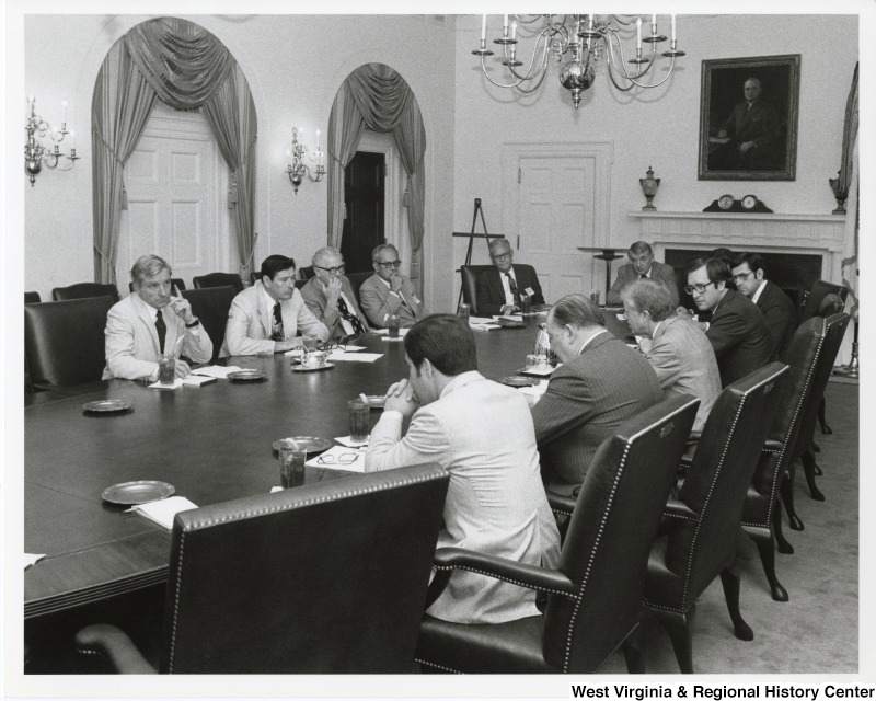 - President Carter discussing coal with Governor Jay Rockefeller, Senator Jennings Randolph (D-WV), Congressman Nick Rahall II (D-WV), Senator Charles Percy (R-IL), and Congressman Austen Murphy (D-PA) at the White House. They are sitting across from five unidentified men. From left to right: (foreground) Congressman Rahall, Senator Randolph, President Carter, Governor Rockefeller.
