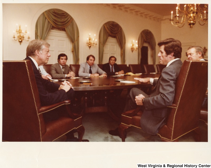 - President Jimmy Carter talking with Congressman Harley Staggers (D-WV) (hidden), Congressman Nick Rahall II (D-WV), Frank Moore a White House aide, Congressman Jim Broyhill (R-NC), and Congressman Jim Florio (D-NJ) about railroad deregulation.
