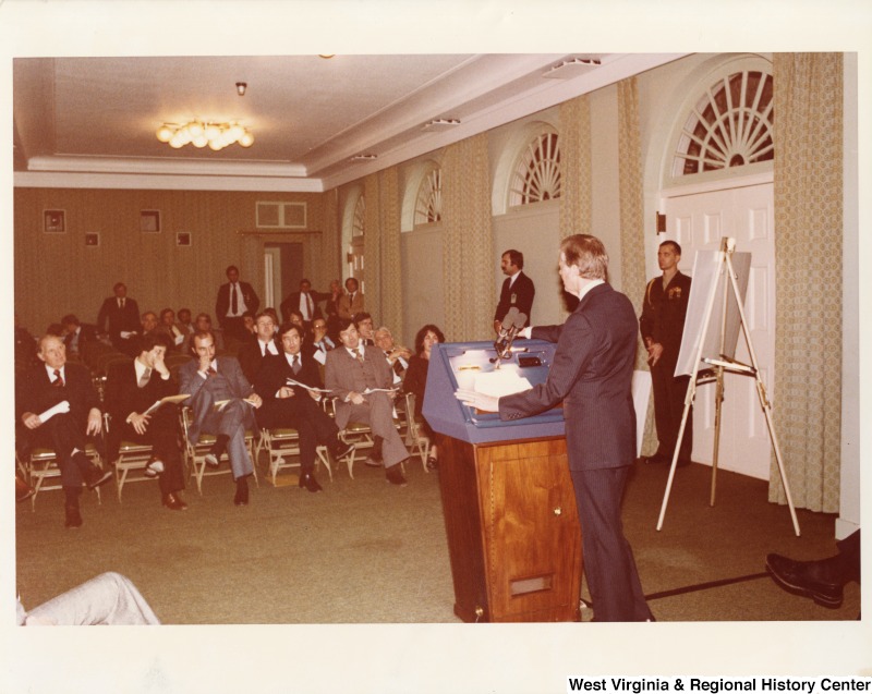 - President Jimmy Carter speaking in front of a small group of men. Congressmen Nick Rahall II is seated in the first row, fourth from the left.