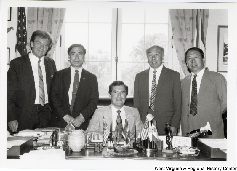 - Congressman Nick Rahall II seated at his desk with four men standing beside him, two on each side. One man is Jack Fairchild, believed to be the first person on the left.