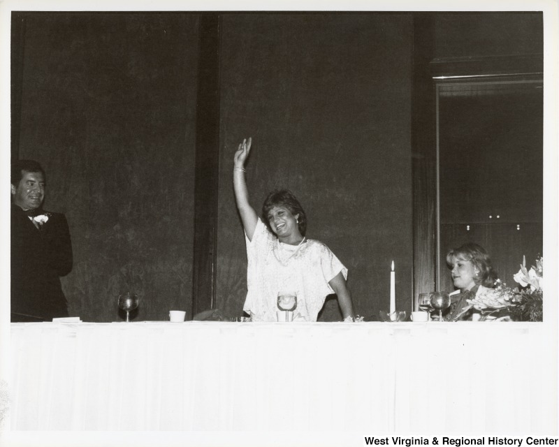 - Olympic medal winner Mary Lou Retton waving. Congressman Nick Rahall II is standing to her right (left side of the photo).