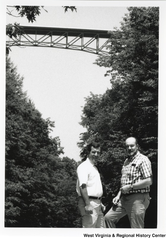 Photograph of Congressman Rahall and an unidentified man below the Glade Creek Bridge