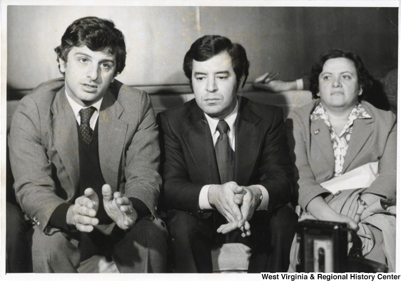 - Congressman Moffett, Rahall, and Oakar speaking at a press conference on their departure to Beirut to Damascus. From left to right: Congressman Toby Moffett (D-CT), Congressman Nick Rahall II (D-WV), Congresswoman Mary Rose Oakar (D-OH).