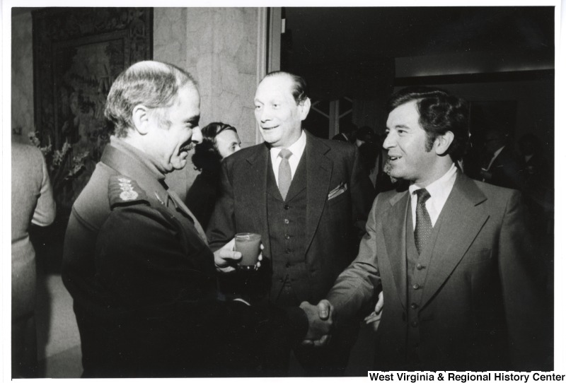 - Congressman Nick Rahall II shaking the hand of the Lebanese Army Liaison. The U.S. Ambassador John Gunther Dean is standing beside Rahall. They are at the U.S. Ambassador's home.