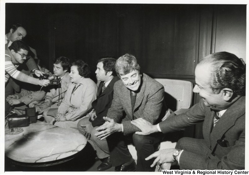 - From left to right: Congressman Bob Carr (D-MI) who is hidden by the arms of the press, Congressman Toby Moffett (D-CT), Congresswoman Mary Rose Oakar (D-OH), Congressman Nick Rahall II (D-WV), Congressman Pete McCloskey (R-CA), and the Chairman of Lebanon's Public Works Committee. The Congressmen are being interviewed by the press upon their arrival at the Beirut airport.