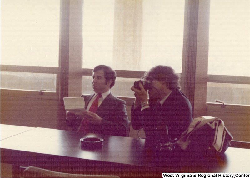 - Congressman Nick Rahall and Congressman Bob Carr meeting in Shimon Peres of the Labor Alignment Party's office. Congressman Carr is taking a photograph.