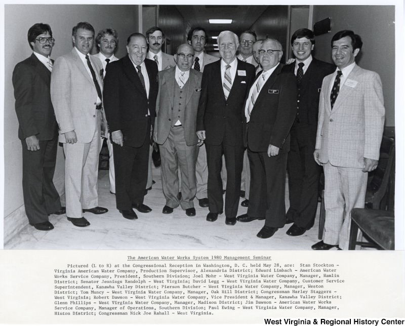 - From left to right at the Congressional Reception in Washington, D.C. held May 28 are: Stan Stockton, Production Supervisor for the Alexandria District of the Virginia American Water Company; Edward Limbach, President of the Southern District of the American Water Works Service Company; Joel Mohr, manager of the Hamlin district of the West Virginia Water Company; West Virginia Senator Jennings Randolph; David Legg, Customer Service Superintendent of Kanawha Valley District of the West Virginia Water Company; Pierson Butcher, Manager of the Weston District of the West Virginia Water Company; Tom Muncy, Manager of the Oak Hill District of the West Virginia Water Company; West Virginia Congressman Harley O. Staggers; Robert Dawson, Vice President and Manager of the Kanawha Valley District of the West Virginia Water Company; Glenn Phillips, Manager of the Madison District of the West Virginia Water Company; Jim Dawson, Manager of Operations of the Southern District of the American Water Works Service Company; Paul Ewing, Manager of the Hinton District of the West Virginia Water Company; and West Virginia Congressman Nick Joe Rahall II.