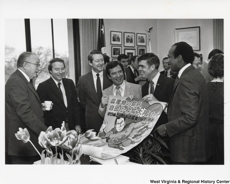 - Photograph of Congressman Rahall, Jerry Huckabee, Secretary of Commerce and three unidentified men looking at a Japanese poster