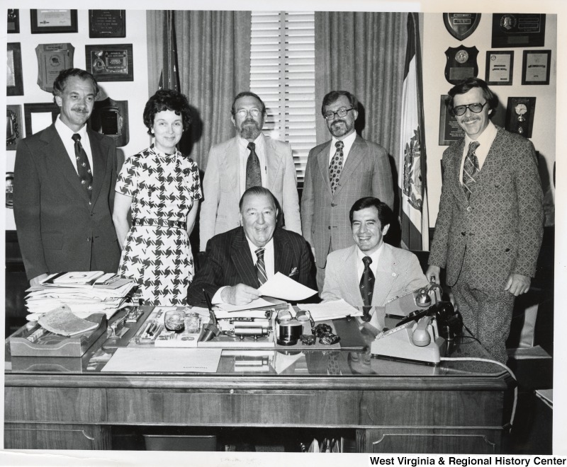 - Seated at the desk are Senator Jennings Randolph, and Congressman Nick Rahall II. Five unidentified people are standing behind them. They are in Senator Jennings Randolph's office.