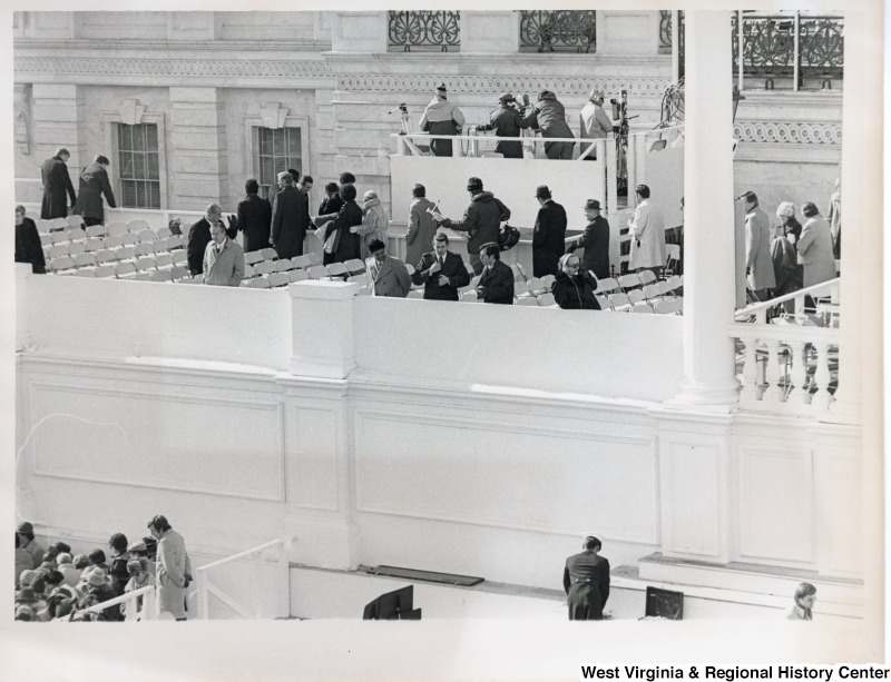 - Congressman Nick Rahall II with two unidentified men looking over a balcony.