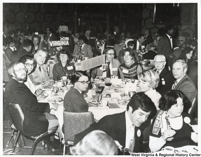 - A unidentified group of people sitting at a table labeled "West Virginia." Congressman Nick Rahall II and his first wife, Helen, is seated at a neighboring table. They can be seen in the right corner of the photograph.