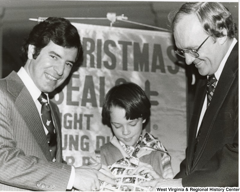 - Congressman Nick Rahall II, a unidentified boy and Dick Calloway, WWNR; St. Albans(?) mayor at the Christmas Seals event at the Charleston Capitol Building.