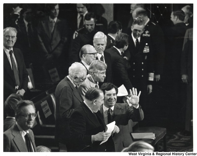 - From left to right: Senator Jennings Randolph (D-WV), Congressman Nick Rahall II (D-WV), Senator Howard Metzenbaum (D-OH), Congressman John Melcher (MT), Senator John Stennis (D-MS), and Senator Fritz Hollings (D-SC) at a State of the Union Address given by President Carter.