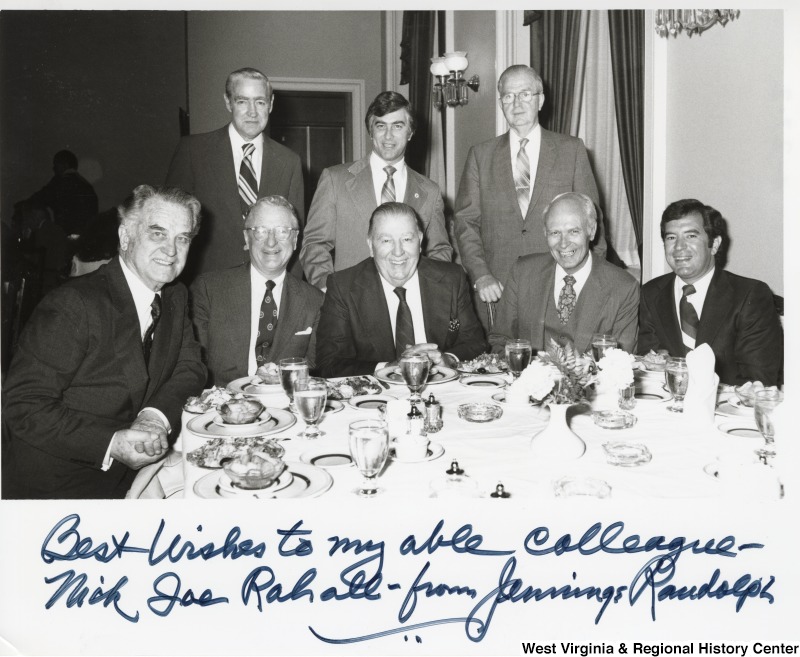 - From left to right: Congressman Bob Mollohan, an unidentified man, a unidentified man, Congressman Mick Staton (middle back), Senator Jennings Randolph (seated center), an unidentified man, a unidentified man, and Congressman Nick Rahall II dinning in the Senators' Dining Room in the U.S. Capitol. The photograph is signed "Best wishes to my able colleague - Nick Joe Rahall - from Jennings Randolph."