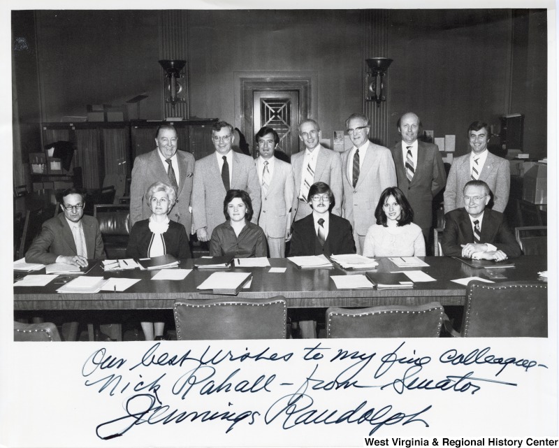 - From left to right: Senator Jennings Randolph (standing); Birdie Kyle (seated, blonde), Randolph's main staffer, who later worked from Rahall; Congressman Nick Rahall (standing third from the left); Mike Fulton (fourth seated), staffer to Alan Mollohan; Mick Staton (last person standing). The rest of the people are unidentified staffers. Congressman Nick Rahall with Senator Jennings Randolph in a meeting with other staffers for the Senate Transportation Committee. Photograph is signed "Our best wishes to my fave colleague - Nick Rahall - from Senator Jennings Randolph. "
