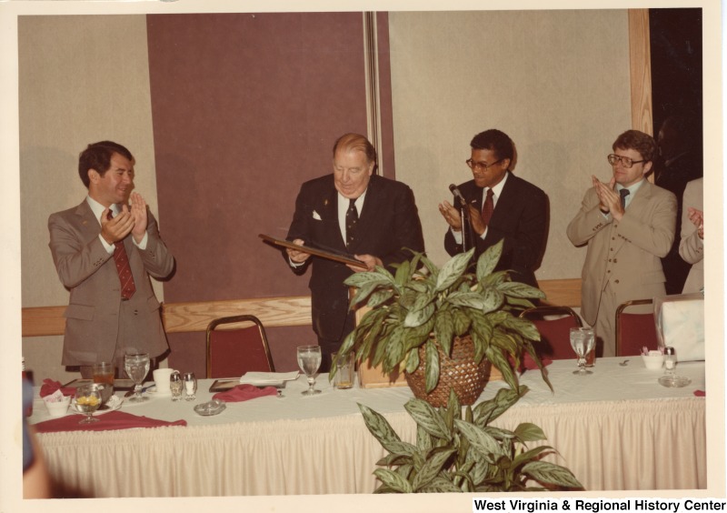- From left to right: Congressman Nick Rahall; Senator Jennings Randolph; Huntington City Mayor Joe Williams; Huntington Council Dallas Tracker; and Mrs. Robert C. Byrd (Erma) at the Holiday Inn in Huntington, W.Va. Senator Jennings Randolph is receiving an award.