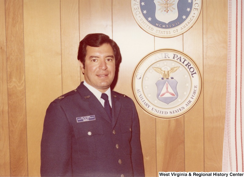 - Congressman Nick Rahall II standing beside the insignia for the Civil Air Patrol, Axillary United States Air Force.