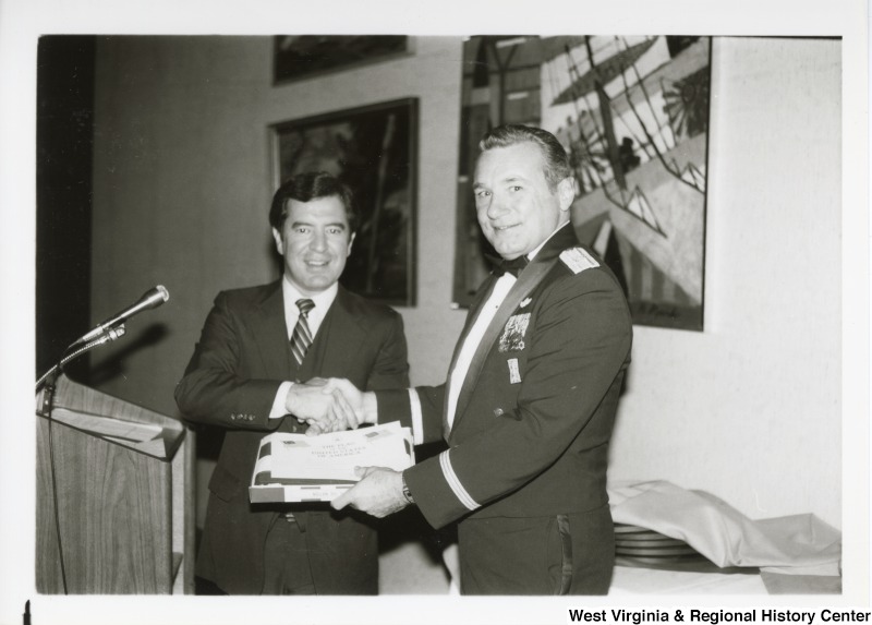 - Congressman Nick Rahall II shaking the hand of an unidentified man. They are handing off a box at the same time.
