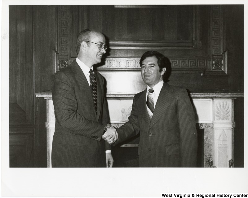 - Congressman Nick Rahall II shaking hands with an unidentified man.