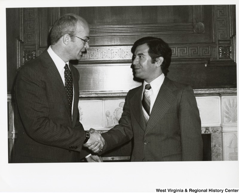 - Congressman Nick Rahall II shaking the hand of an unidentified man