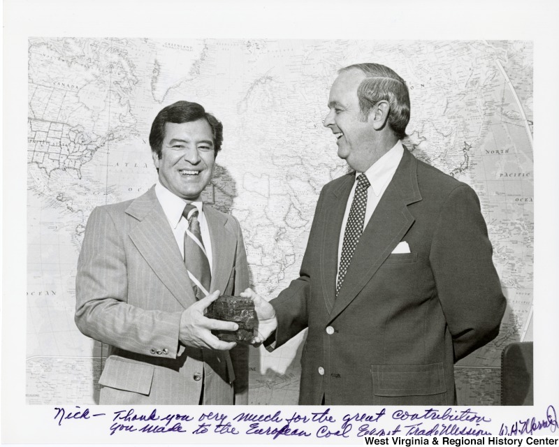 - Congressman Nick Rahall II with Assistant Secretary for Trade Development in Department of Commerce, William Morris, Jr, upon his return from Spain, Italy, and France for a U.S. coal export mission. The photograph is signed 'Nick - Thank you very much for the great contribution you made to the European coal export trade mission. W. H. Morris, Jr.'