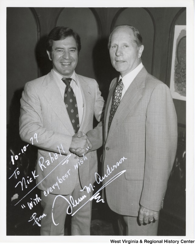 - Congressman Nick Rahall II shaking the hand of Congressman Glenn Anderson (D-CA), Chair of Transportation Subcommittee. The photograph is signed "To Nick Rahall -- "With every best wish" from Glenn M. Anderson.