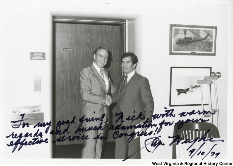 - Congressman Nick Rahall II shaking the hand of Congressman Jim Wright (D-TX). The photograph is signed: "To my good friend, Nick, with warm regards, and much admiration for your effective service in Congress! - Jim Wright."