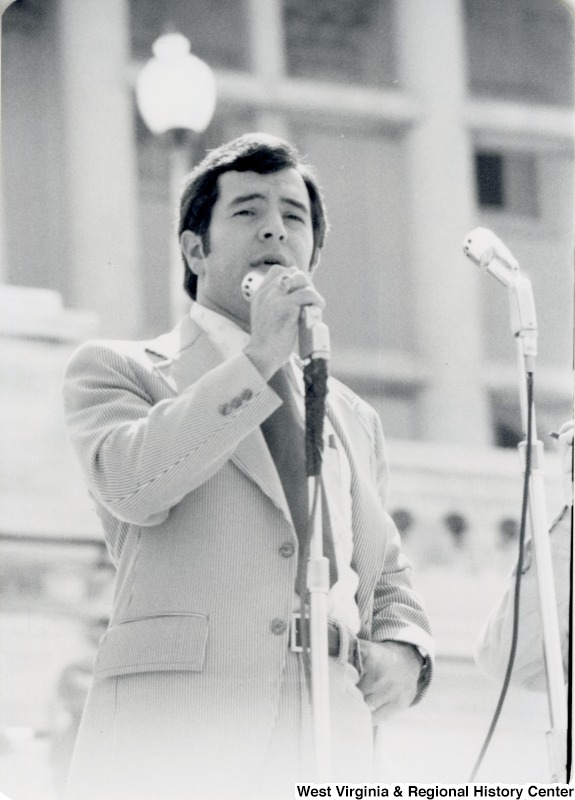 - Congressman Nick Rahall II speaking into a microphone.