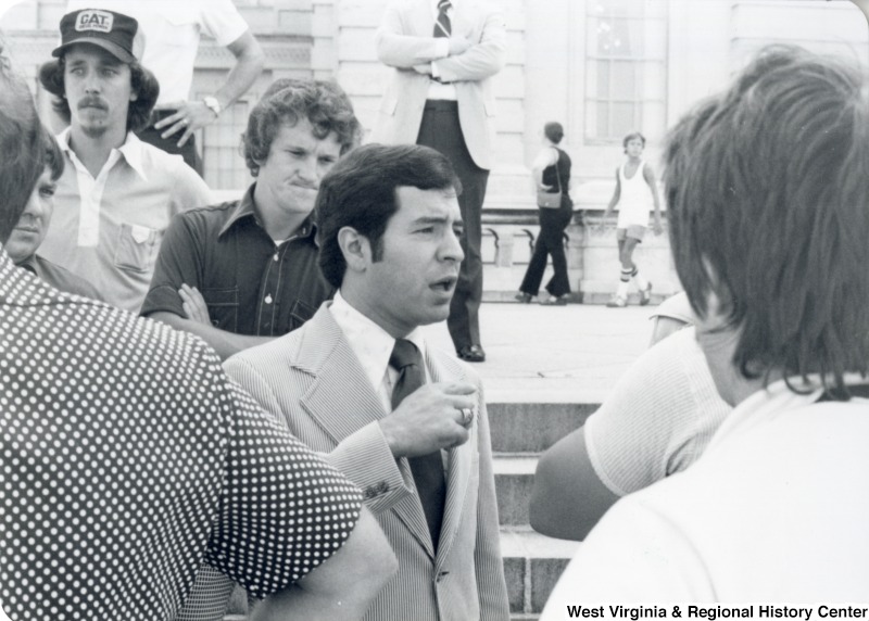 - Congressman Nick Rahall II standing in a unidentified group of people. He is speaking to a unidentified person.