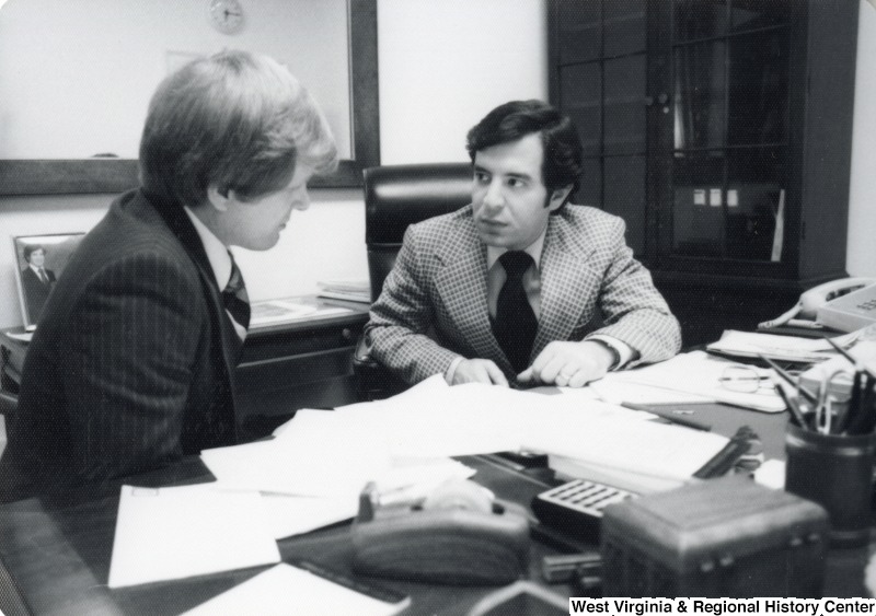 - Congressman Nick Rahall II seated at a desk with a unidentified man.