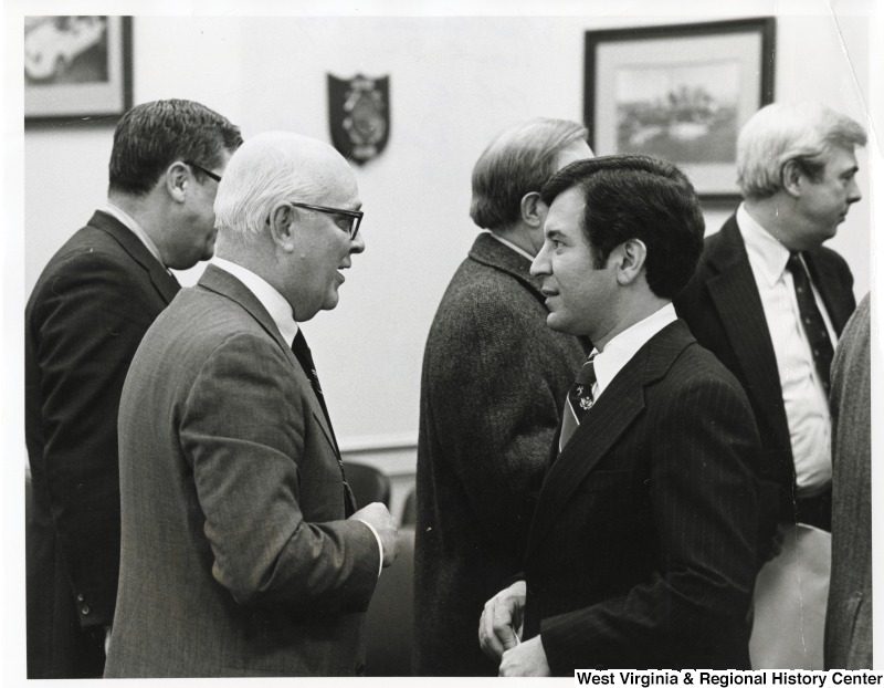 - Congressman Nick Rahall II (front right) speaking to David Rodrick at a Steel Caucus Meeting. Three unidentified people are standing behind them.