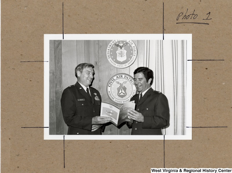 - Congressman Nick Rahall II holding a Civil Air Patrol annual report to Congress for 1981 with Brigadier General Miller. Behind them are the insignias for the Department of the AIr Force and the Civil Air Patrol.