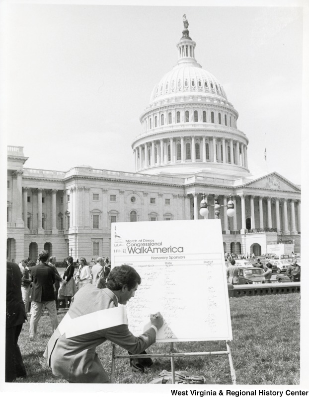 - Congressman Nick Rahall II signing a board to be an honorary sponsor for the March Of Dimes Congressional WalkAmerica event. The U.S. Capitol Complex can be seen in the background.