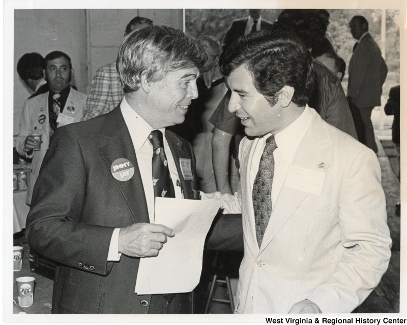 - Congressman Nick Rahall speaking to an unidentified man wearing a Jimmy/ Jay button.
