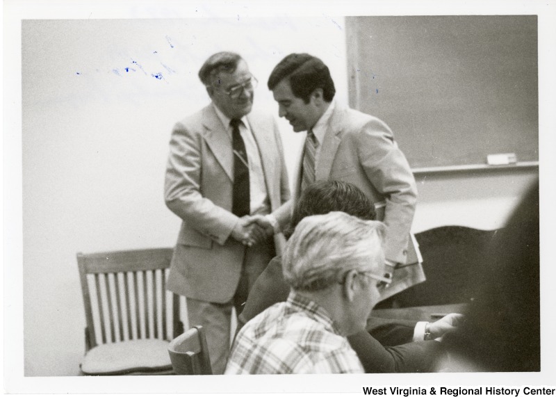 - Congressman Nick Rahall II shaking the hand of an unidentified man in the Trade Union Internship Program.