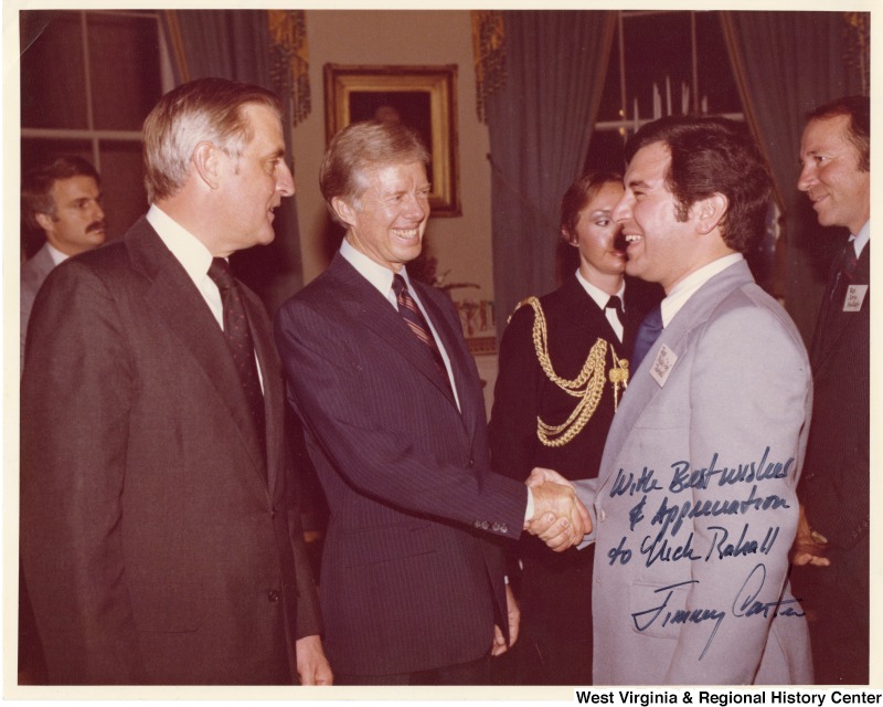 - From left to right: Vice President Walter Mondale; President Jimmy Carter; Congressman Nick Rahall II (D-WV); and Congressman Jerry Huckaby (D-LA) at the White House for an early Carter support dinner. The photograph is signed: "With best wishes and appreciation to Nick Rahall." Jimmy Carter.