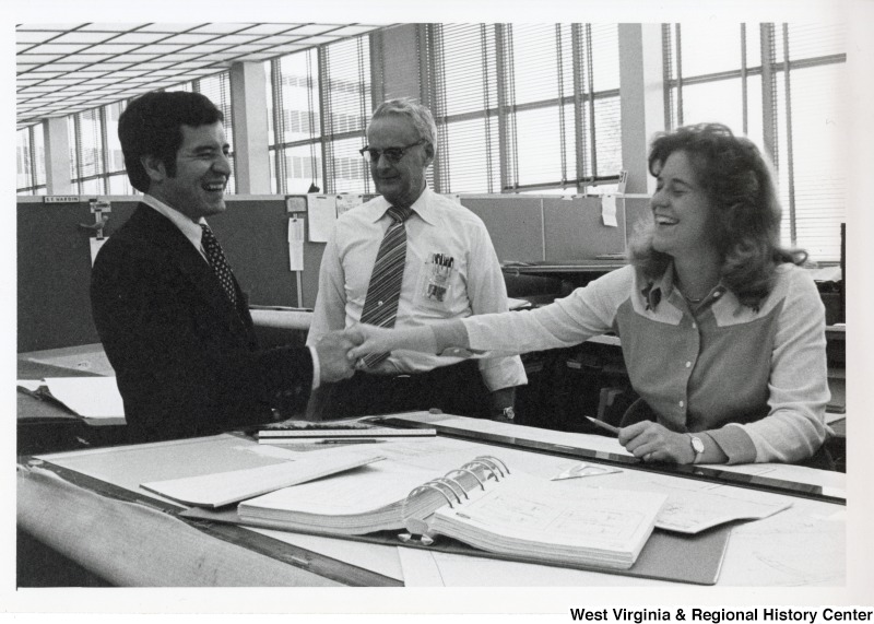 - Congressman Nick Rahall II shaking the hand of an unidentified woman who is sitting at a desk. An unidentified man is standing beside Rahall.