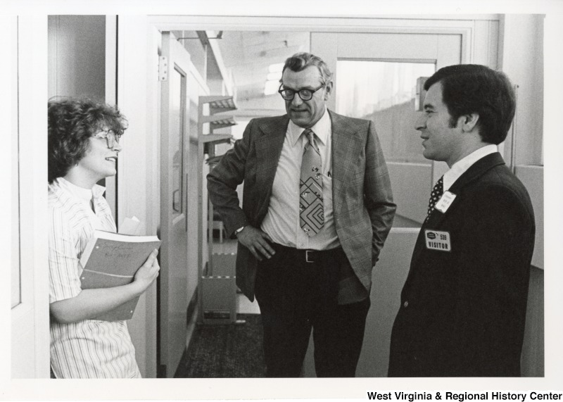- Congressman Nick Rahall II speaking with an unidentified man and woman from Union Carbide.