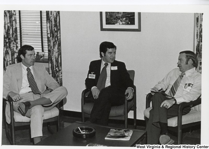 - Congressman Nick Rahall II (center) speaking with two unidentified men from Union Carbide.