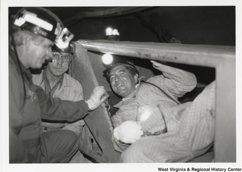 - Congressman Nick Rahall inside of mine car at Old Ben Coal Mine with two unidentified coal miners.