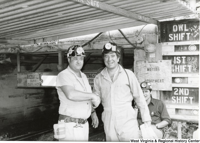 - Photograph of Congressman Rahall shaking hands with an unidentified coal miner at Old Ben Coal Mine