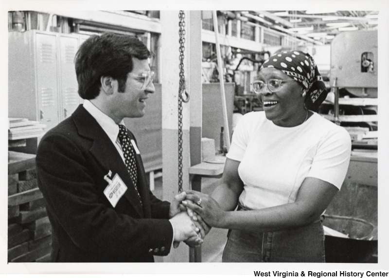 - Congressman Nick Rahall II shaking the hand of an unidentified woman of Union Carbide.